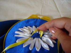 Можно вышить лепесток прокалывая ленту по середине, придерживая ленту, выводим иглу на изнанку. Сильно не затягивая