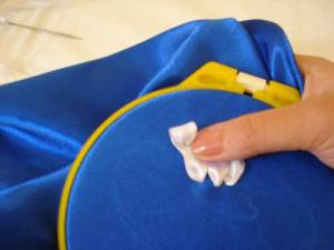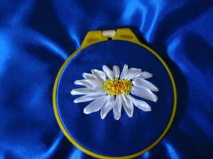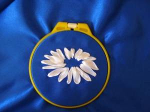 Серединку вышиваем узелками. На иголку накручиваем ленту (два оборота). Прокалываем ткань рядом, выводим иглу на изнанку.