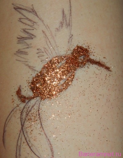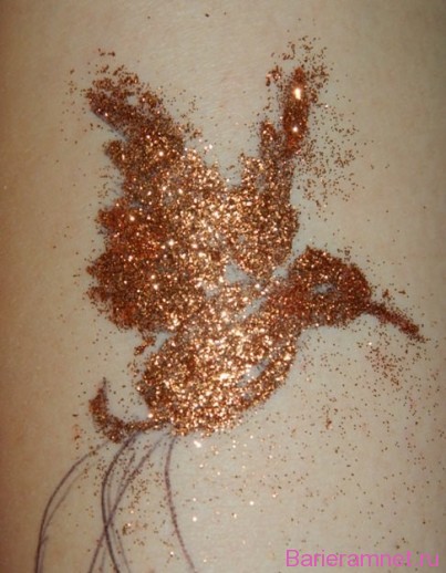 Их используют для украшения тела, и не только взрослого человека, но и маленького ребёнка. А самое интересное то, что в этом виде боди-арта главное не блёстки, а клей, на который их наносят. Все зависит от него, так как длительность временного тату определяется от консистенции и надежности клея.