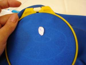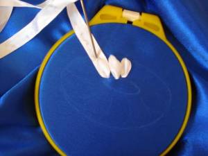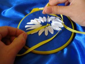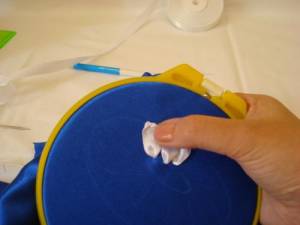 Серединку вышиваем узелками. На иголку накручиваем ленту (два оборота). Прокалываем ткань рядом, выводим иглу на изнанку.