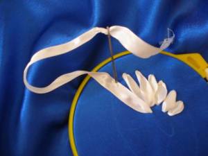 Можно вышить лепесток прокалывая ленту по середине, придерживая ленту, выводим иглу на изнанку. Сильно не затягивая