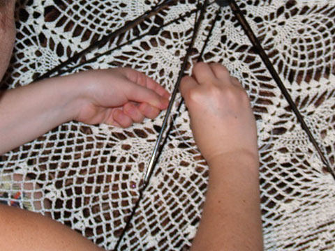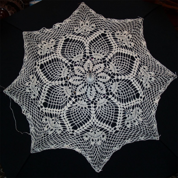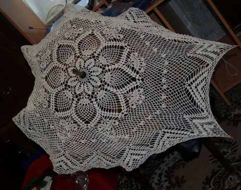 Я буду показывать на примере 8 спиц. Начинаем вязание крючком 2. Середина вяжется чётко по схеме, далее повторяются ряды сетки через 3 ряда – меняем крючок на 2.5, продолжаем вязание, время от времени прикрепляя полотно к каркасу булавками. Если Вы используете тканевый зонт – не спешите обдирать ткань – на ней удобнее примерять, если у Вас “пустой” каркас – используйте как манекен готовый зонт. Если ширина полотна получается не достаточной – увеличивайте количество воздушных петель в арках или можете поменять крючок на 3. Не ленитесь лишний раз примерить!!! Это менее трудозатратно, чем потом перевязывать.
