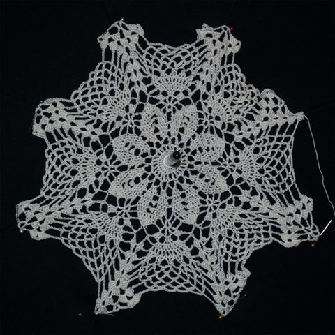 Итак, полотно готово! Надеваем центр на штырь каркаса и, начиная от середины, по кругу прикалываем полотно на спицы, равномерно натягивая.